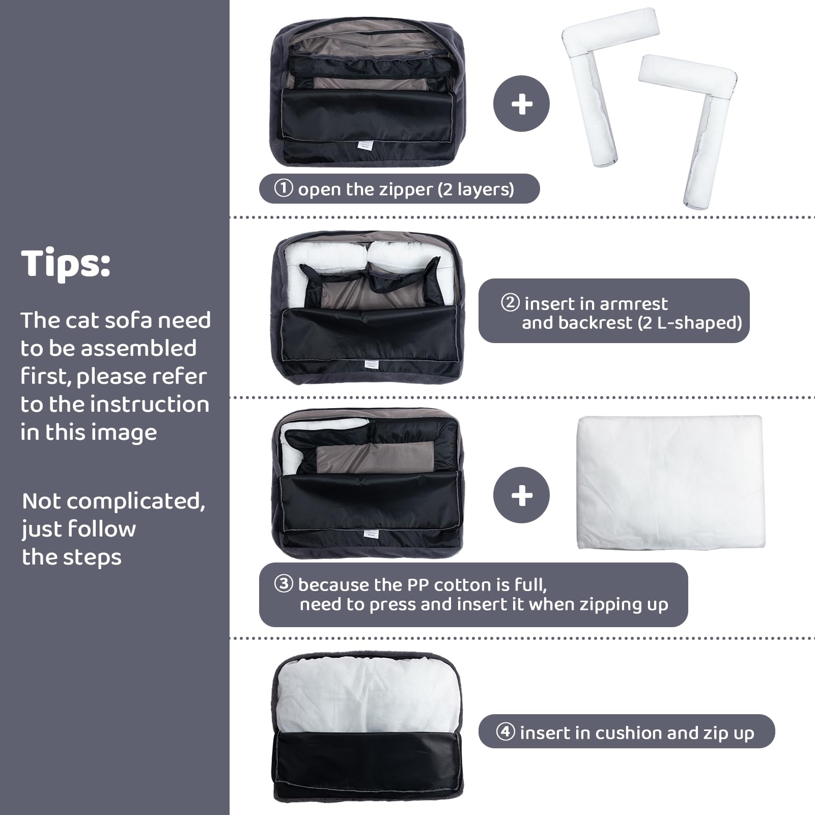 • Notice: After opening the package, only take 2-3 minutes to assemble the liner and cover, according to the instruction manual. Since it is vacuum packed, the PP cotton is compressed, need to wait 24-48 hours to return to its full shape. Please pat and pull it to help the cat bed expand faster